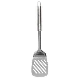 Ideal for everyday meal prep use, this slotted turner is ideal for turning grilled meat and has a built-in separator edge.