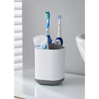 A contemporary toothbrush holder, with two compartments for storing toothbrushes and toothpaste.